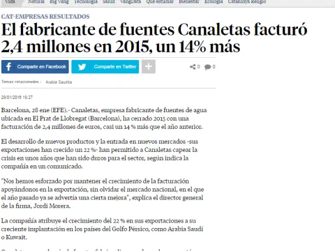 Canaletas, empresa fabricante de fuentes de agua ubicada en El Prat de Llobregat (Barcelona),ha cerrado 2015 con facturación casi un 14 % más que el año anterior.