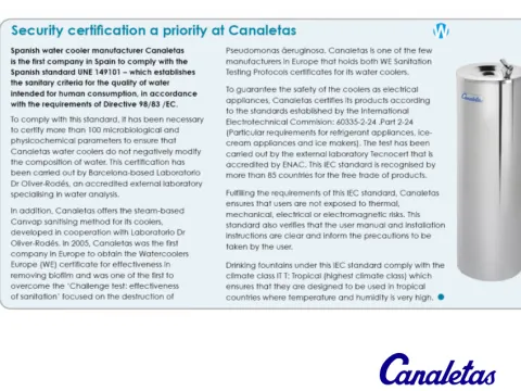 La empresa familiar Canaletas cumple con los parámetros de Real Decreto 140/2003 que establecía los criterios sanitarios de la calidad del agua para consumo humano conforme a las exigencias de la Directiva de la Unión Europea aprobada en 1998. Los diversos ensayos realizados garantizan que las fuentes de Canaletas no alteran la composición del agua de acuerdo con los parámetros establecidos por la mencionada norma.